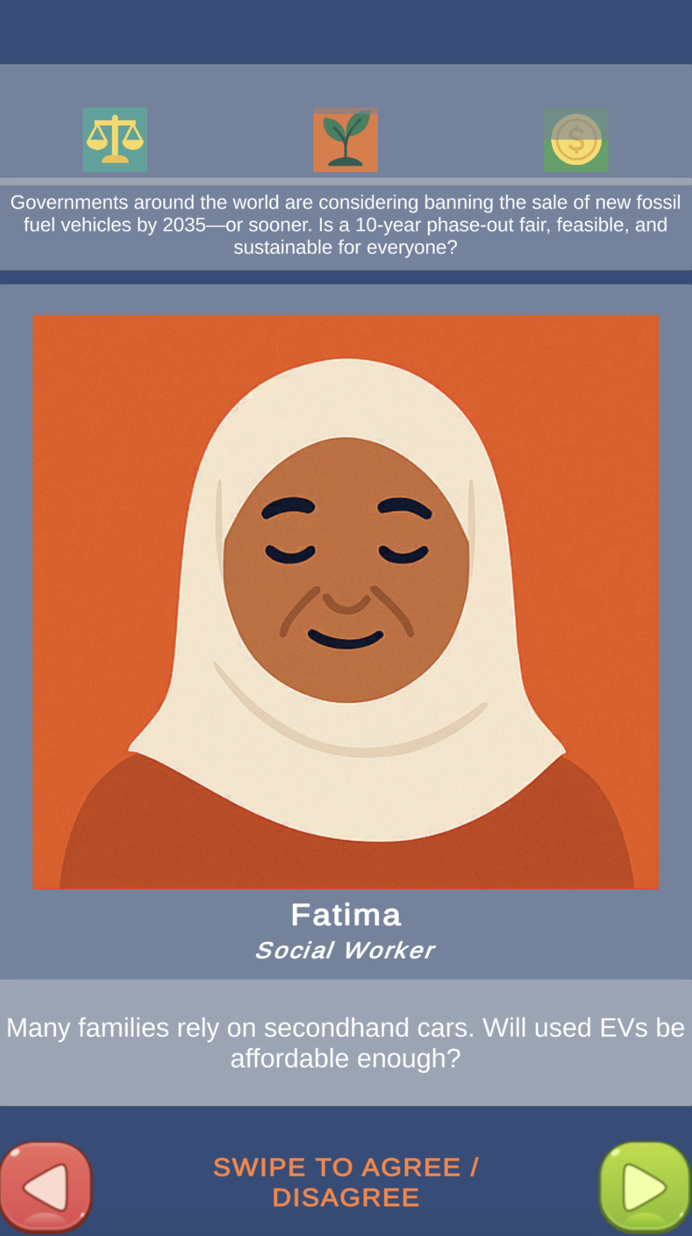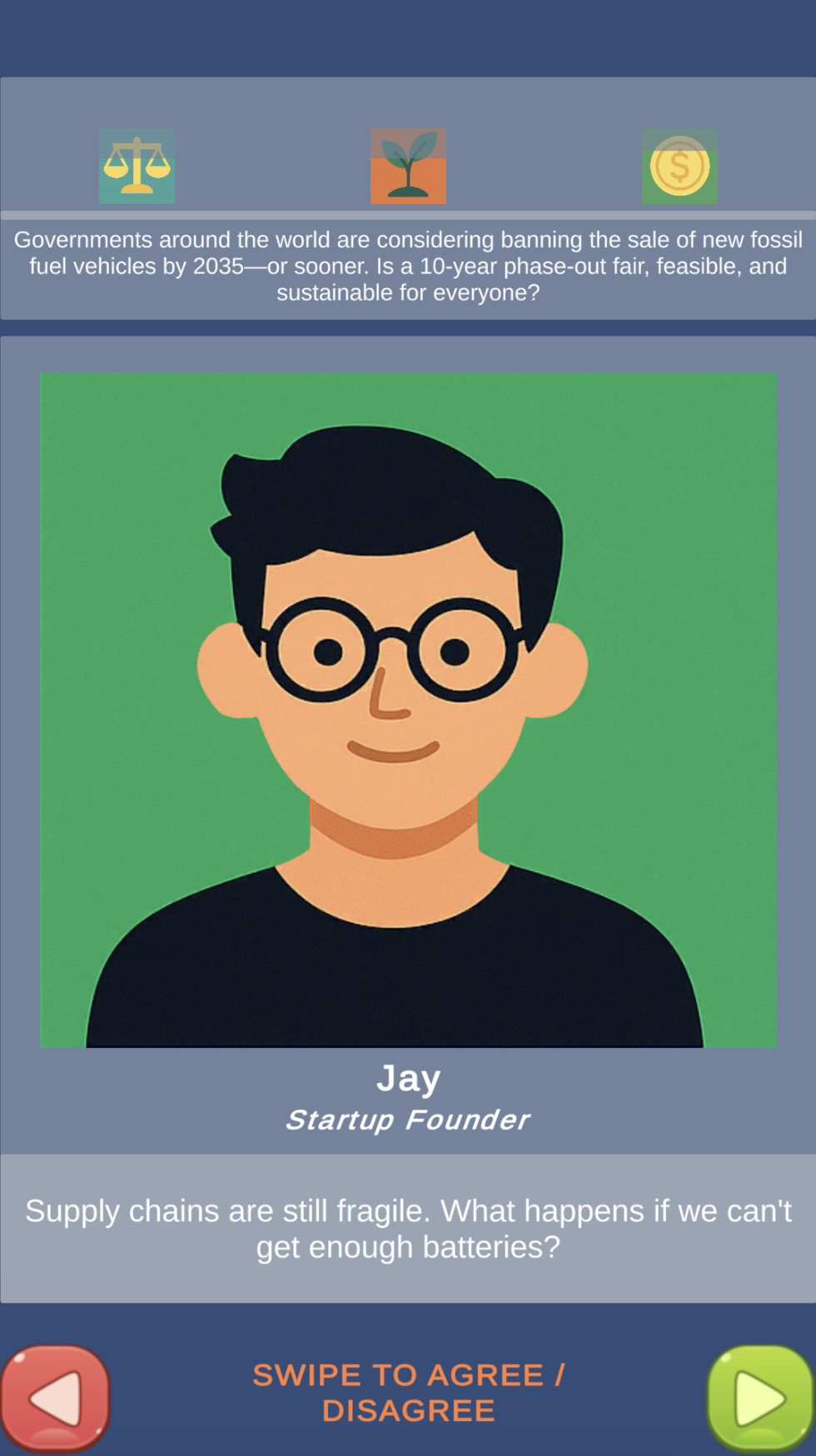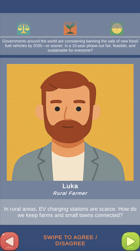 Description: Vox Pop is a mobile narrative / decision-making game along the lines of Reigns meets Wordle, where each day you (and all other players) join a global citizens’ assembly, and are given a new daily question or pressing issue of our time, be it phasing out fossil fuels or implementing a Universal Basic Income. Through your choices, you try to balance fairness, sustainability, and cost, never letting any of them get to 0 (game over) - and at the end of each day's session you get a shareable outcome / proposal for a solution that’s tailored to your choices!